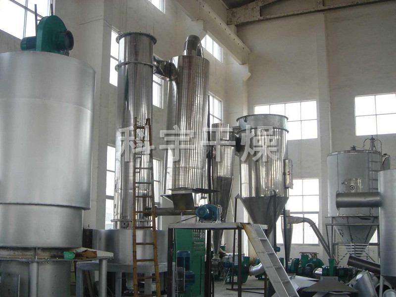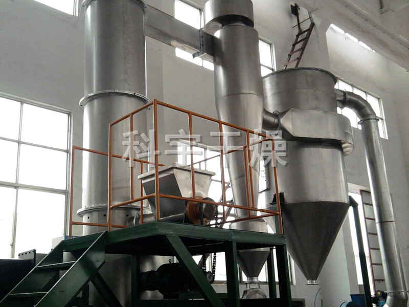 热空气切线进入干燥器底部,在搅拌器带动下形成强有力的旋转风场。膏状物料由螺旋加料器进入干燥器内,在高速旋转搅拌桨的强烈作用下,物料受撞击、磨擦及剪切力的作用下得到分散,块状物料迅速粉碎,与热空气充分接触、受热、干燥。脱水后的干物料随热气流上升,分级环将大颗粒截留,小颗粒从环中心排出干燥器外,由旋风分离器和除尘器回收,未干透或大块物料受离心力作用甩向器壁,重新落到底部被粉碎干燥。